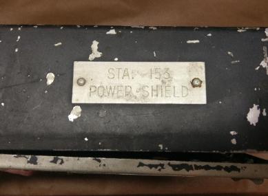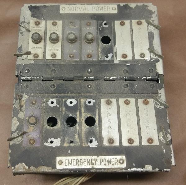 Fuze Box or Panel, Station 153, above three photos. This aircraft fuze box has an unknown application. It has the part number 237-2480 and a nomenclature plate STA.-153 POWER SHIELD. One fuze is marked AN/ARA-26, which is the Emergency Keyer Group used with the AN/ARC-3, AN/ARC-8, AN/ARC-21, AN/ARC-27, AN/ARC-34, AN/ARC-36, AN/ARC-49 and AN/ARC-66 which were used in the B-47, B-52, B-66, RC-121, C-130, KC-135, B-50 and H-21, plus possibly others. When obtained it was said to have come from a B-29 Super Fortress. Not currently allocated to a restoration project. |
