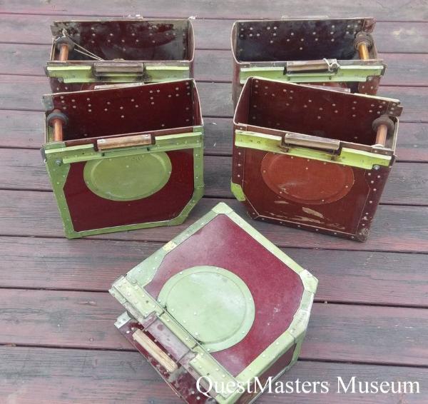 U.S. A-26 "Invader" Medium Bomber, AN-M2 .50 Caliber Machine-Gun, Ammunition Boxes, above left photo. Four of these phenolic and aluminum ammunition boxes were mounted in the A-26 "Invader" nose section to supply the machine-guns. U.S. B-25 "Mitchell" Medium Bomber, AN-M2 .50 Caliber Machine-Gun, Ammunition Box, above right photo. This phenolic and aluminum ammunition box was mounted in the B-25 "Mitchell" nose section to supply the machine-guns. This style box was used in the green-house nose version of the B-25. |