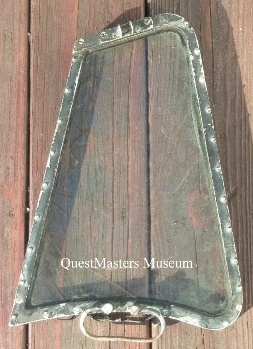 U.S. Army WWII Lockheed "Hudson" Co-Pilot Vent Window, above photo. This WWII Vent Window was produced by Lockheed for the A-28 and A-29 "Hudson" Light Bomber Aircraft. The US Navy operated the A-29's, redesignated the PBO-1. This vent window is for the co-pilot side of the cockpit and is optically clear without any cracks. |