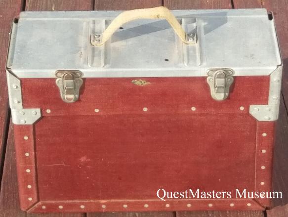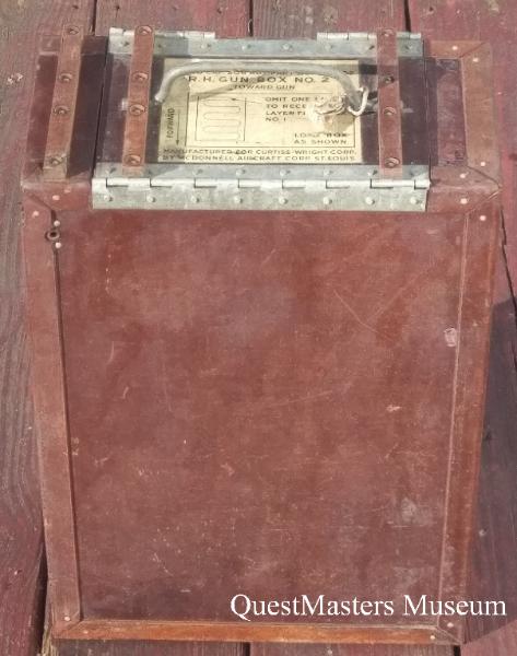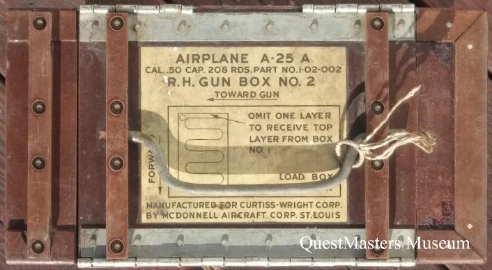 U.S. Army A-25A "Shrike" Dive Bomber, AN-M2 .50 Caliber Machine-Gun, Ammunition Box, above two photos. This phenolic and aluminum ammunition box was mounted in the rear gunner position of the twin mounted AN-M2's of the Custiss A-25A "Shrike", the Army version of the Navy SB2-C "Helldiver". Four of these ammunition boxes were carried, two for each gun. The above example is for the right-hand gun, box number 2. Box number 1 would feed the AN-M2, and when empty, would draw continuous ammunition from box number 2. |