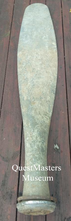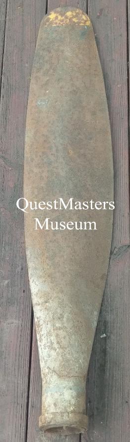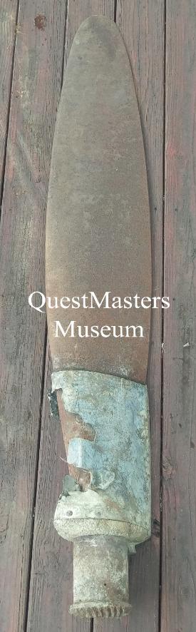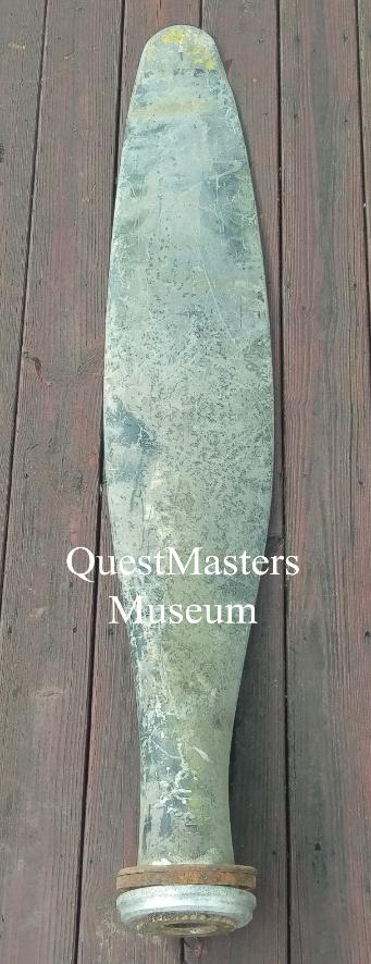 U.S. WWII Aircraft Propellers, above four photos. The above WWII propellers were recovered from a wartime aircraft scrapping field. None of them have been on an aircraft since WWII and have pitting, slight damage or handling marks/dents. None of these propellers are airworthy. The WWII propeller, far left, is marked DWG 6359A-18CHG MFG. NO. 7189 CONT. NO.-LL-92031 1 and measures 72.5" long. It was used on the B-25 "Mitchell" and A-26 "Marauder" Medium Bombers. WWII Propeller, second from left, markings near base difficult to read due to pitting. Partially readable: 6215-13 (possibly) and A.C. SERIAL 36-2841. Stenciled marking on front of blade has date of 8-44. 66 1/2" long. Some original paint. Believed to be from C-47 "Skytrain" Cargo Aircraft. WWII Propeller, second from right, no visible markings. Steel propeller with aluminum cuff. 70" long, from tip to spline on bottom. Believed to be from an early model P-47 "Thunderbolt" Fighter Aircraft or P-61 "Black Widow" Night Fighter. WWII Propeller, far right, no visible markings. Steel propeller. 62.5" long. Produced by AEROPROP and used on the P-63 "King Cobra" Fighter Aircraft. Some original paint on unrestored example. (two in collection, one unrestored, one restored) |