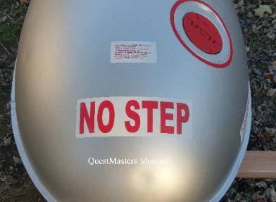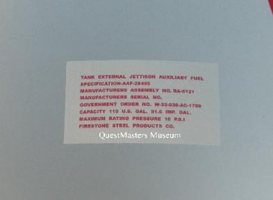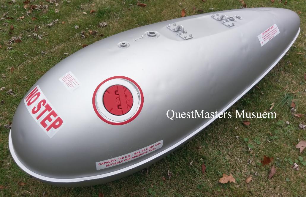 WWII United States 110-Gallon Aircraft Drop Tank, above four photos. This WWII produced 110-Gallon aircraft drop tank was obtained by QuestMasters in 2018, in rusty condition. After complete sand blasting and filling of all of the pitting in the steel body, the drop tank was painted in the correct aircraft silver paint. The replica nomenclature and warning decals, produced in-house, were then applied to the outside of the tank. This drop tank was produced by the Firestone Steel Products Company. These external fuel tanks were produced for mounting under the wings of fighter aircraft, like the P-51 "Mustang", to extend the operational distance of the aircraft for bomber escort or extended distance missions. This restoration was completed in November 2020. This drop tank is not for sale. |