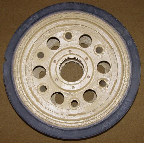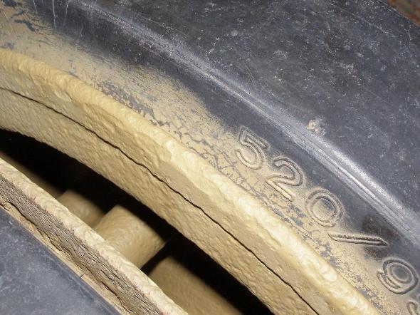 | German Panzerkampfwagen III or PzKpfw III Track Road Wheel, above two photos. The photo on the left shows the original ordnance tan paint over sprayed on the rubber part of the road wheel. The paint on the steel part of the wheel is new. The rubber wheel is marked with the maker: FULDA, the size: 520/95 - 397 and 50753 0 32K 3, which may indicate the production lot number. |
