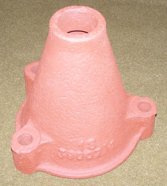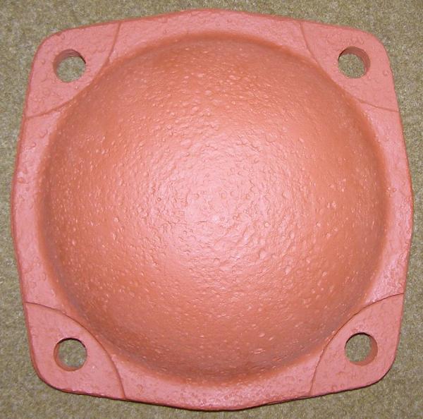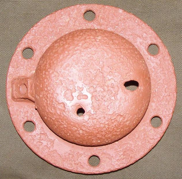 | German Panzerkampfwagen III or PzKpfw III Track Return Wheel Support, above left photo. The return wheel support has raised cast markings: 18 39007\1 It has been crushed glass blasted and repainted in red oxide primer. This support was recovered from Belgium in 2011. German Panzerkampfwagen III or PzKpfw III Track Road Wheel Center Cap, above right photo. It has been crushed glass blasted and repainted in red oxide primer. The two holes that penetrate the cap were caused from bullets or shrapnel vice oxidation. The center cap was recovered from Kurland, Latvia in 2011. |