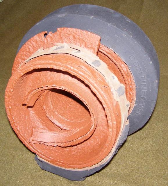 | German Panzerkampfwagen III or PzKpfw III Track Return Wheel, above two photos. The rubber wheel is marked: No 723 CONTINENTAL (310) 70-203 7 KO. This wheel has suffered violent damage due to the destruction of this Panzer III. The outer rubber wheel has the remains of ordnance tan paint over spray. The outer wheel center cap was torn off during the explosion leaving the six seared bolts inside. The inside wheel rubber has been almost completely blown off. The inside bearing race was torn when the wheel was blown off of the tank. Casting seams on the face of the rubber indicate moderate use. This road wheel was recovered from a forest near Birx in Thüringen, Germany 2011. It has been crushed glass blasted and repainted in red oxide primer. |
