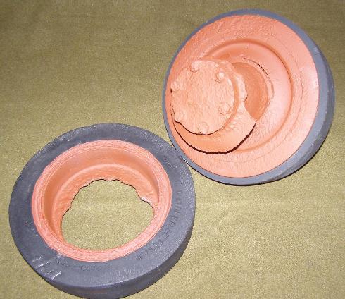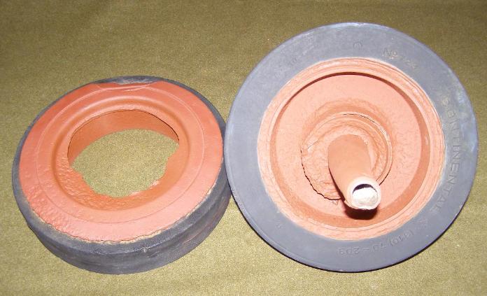| German Panzerkampfwagen III or PzKpfw III Track Return Wheel, above two photos. The outer rubber wheel is marked: No 723 CONTINENTAL 310/70-203 10 A08 2N. The inner rubber wheel is marked: No 723 CONTINENTAL (310) 70-203 8 KO. This wheel has suffered violent damage due to the destruction of this Panzer III. The outside wheel has been completely blown off. The wheel axle remains attached to the center of the wheel. Casting seams on the face of the rubber indicate minimal use. This road wheel was recovered from a forest near Birx in Thüringen, Germany 2011. It has been crushed glass blasted and repainted in red oxide primer. |