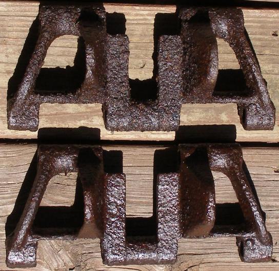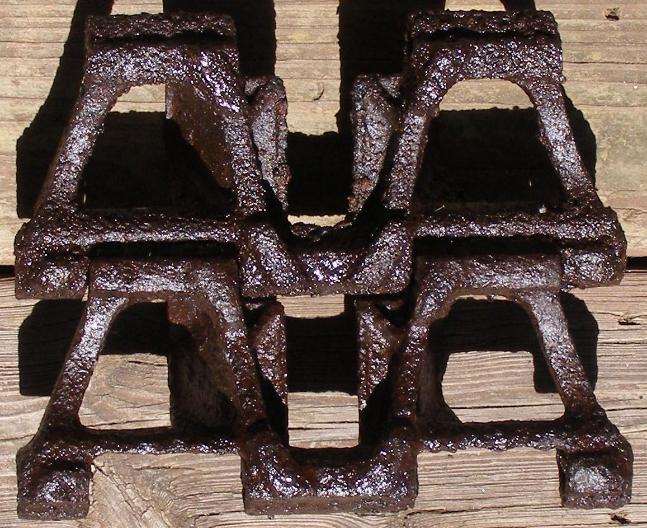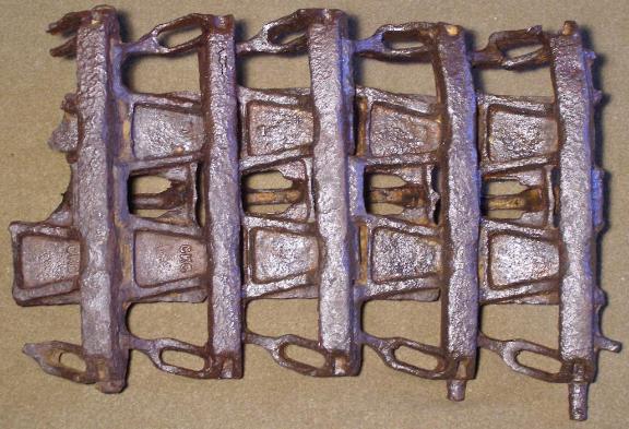 | German Panzerkampfwagen or PzKpfw III and IV Track Links, early type, above two photos. The track links shown above are the early style that have an open center track tooth. These tracks do not have the raised "V" on the face or ground mating surface. Both tracks are marked with the manufacturer code: "boy". These track links were recovered from Kurland, Latvia. |