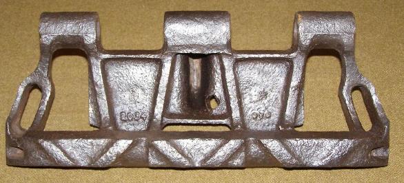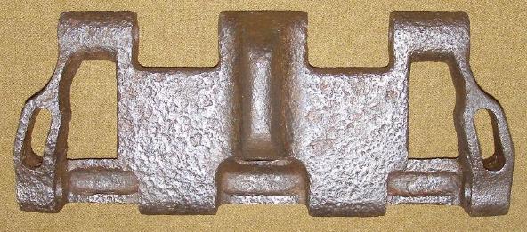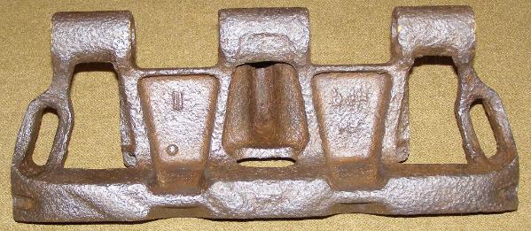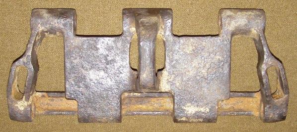 | German Panzerkampfwagen or PzKpfw III and IV Track Link, late type, above two photos. The track link shown above is the late improved style that has a solid center track tooth. This track has the raised "V" on the face or ground mating surface with minimal wear. The track is marked with the manufacturer code: "oxo" and 2034. This track link was recovered from Kurland, Latvia. |