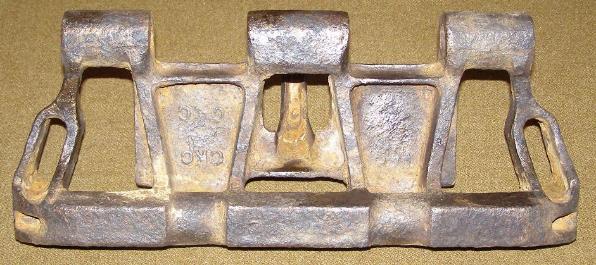 | German Panzerkampfwagen or PzKpfw III and IV Track Link, early type, above two photos. The track link shown above is the early style that has an open center track tooth. These tracks do not have the raised "V" on the face or ground mating surface. The track is marked with the manufacturer code: CKC. This track has the remains of ordnance tan paint, which may indicate that this was a spare track applied to the outside of the tank for additional armor. This track link was recovered from Germany. |