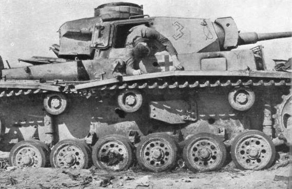 | The German PzKpfw III Ausf L, in the left photo, is from the 10th Panzer Division in North Africa (Nord Afrika). The unit code for the 10th Panzer Division: YIII is painted in yellow next to the radio operator/machine gun position. This Panzer III has been knocked out in Tunisia, in 1943. There are at least seven shell holes in this side of the tank, possibly from a British 6 pound gun. |