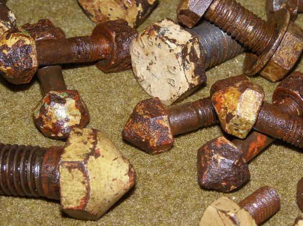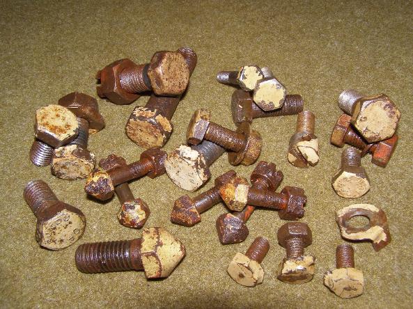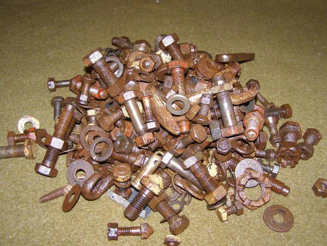 | Panzer Bolts and Hardware, above right two photos. This is a close up of the bolts pictured above. Many of the bolts are painted in ordnance tan paint. All of the bolts are painted in red oxide primer. Several of the bolts have overspray of green paint during camouflaging of the vehicle. It is not known if the bolts and hardware came from one vehicle or multiple vehicles during maintenance. |