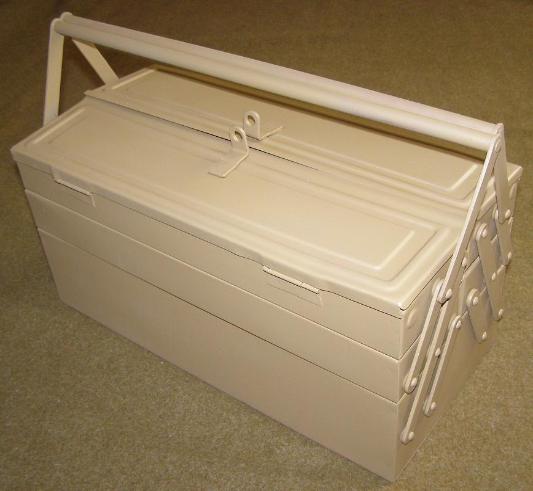 | Panzer Tool Box, above left photo. This tool box was found outside of Luxembourg in the 1990s. When it was found it was completely oxidized. This box has been crushed glass blasted and repainted with red oxide primer and ordnance tan paint. No markings are visible. Panzer Bolts and Hardware, above right photo. The bolts pictured above were found in the tool box pictured on the left. Many of the bolts are painted in ordnance tan paint. It is not known if the bolts and hardware came from one vehicle or multiple vehicles during maintenance. |