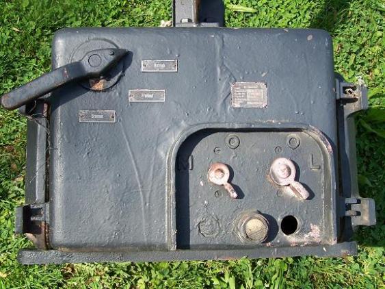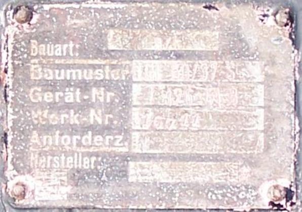 | Left side of mounting base, left photo. This searchlight can be manually or remotely transversed and elevated. Nomenclature plate, right photo. This plate is marked: Bauart azf (azf is stamped), Baumuster GL 60/37 S (GL 60/37 S is stamped), Gerat-Nr. 126_61B (126_61B is stamped), Werk-Nr. 16711 (16711 is stamped), Anforderz (with blank block), Hersteller (with blank block). |