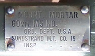 This WWII M2 60mm Mortar, left photo, was restored by QuestMasters. This mortar has the late war M5 Mount with covered transverse screw. The early style mount had an exposed threaded screw which was prone to clogging in the field. Also pictured is the M14 Carry Case (far left) for the M4 Sight (attached to the mount). The barrel cover and carry strap is pictured in the far right of the photo. M5 Mount, Mortar, nomenclature plate, above right photo. This mount is serial numbered 25439, dated 1945 and inspected by A.C.R. |