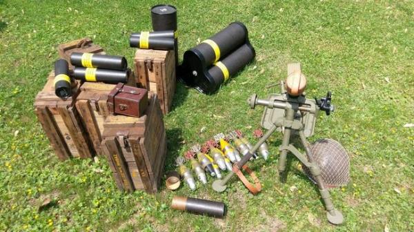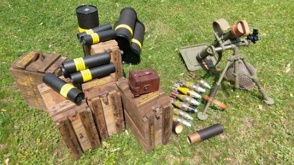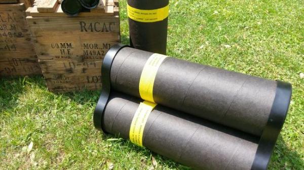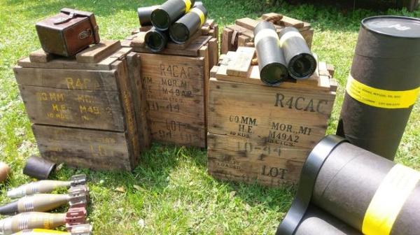 The WWII M2 60mm Mortar set-up, above six photos, in the QuestMasters Museum collection. Shown here is the 60mm M2 Mortar with multiple rounds of M49A2 Ammunition. Also shown are the R4CAC 60mm Mortar Crates and 18 round waterproof fiber shipping containers. |