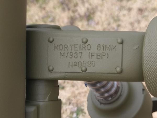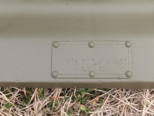 The mortar shown here was used by Portugal as the Morteiro 81mm M/937 (FBP) with serial number 0696. The mortar baseplate is marked Morteiro 8cm M/937 with the serial number 20. It is not known if this mortar was sent to Portugal prior to WWII, serving in the Spanish Civil War or redesignated after WWII with the data plates being added to the bipod and baseplate. |