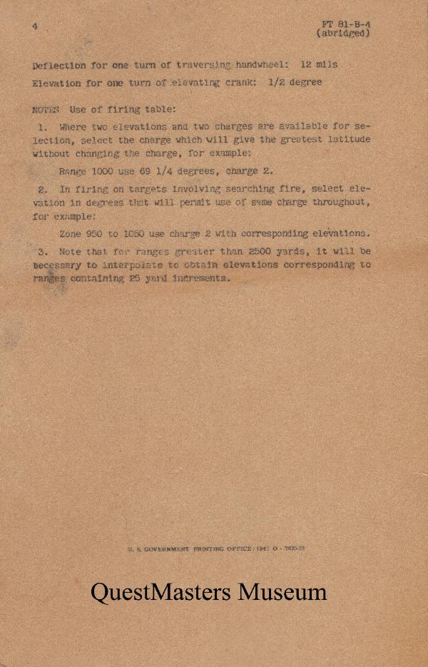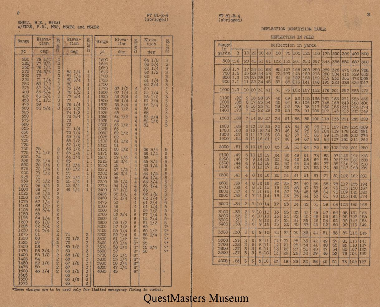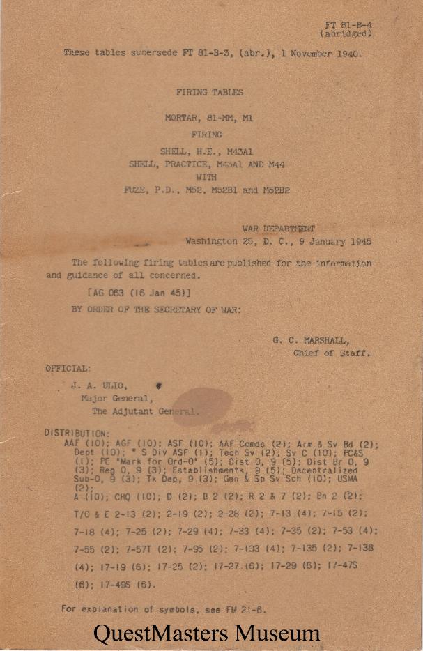 WWII 81mm Mortar Firing Tables, FT81-B-4, above four photos. This firing table was written January 9th 1945 for the M43A1 High Explosive Shell, M43A1 and M44 Practice Shell with M52, M52B1 and M52B2 Point Detonating Fuze. |