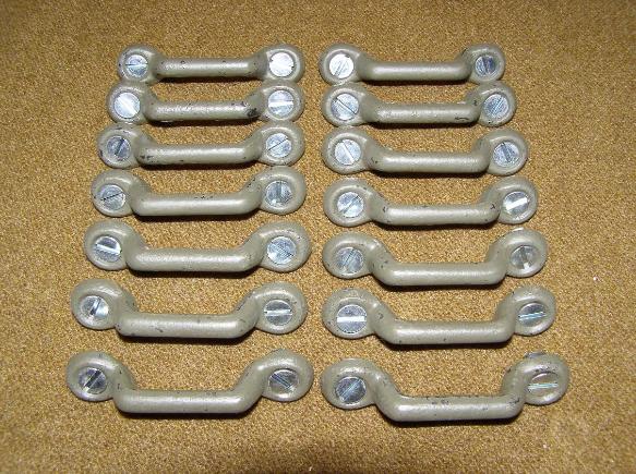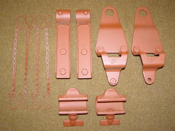 | Top Bow Hardware with Safety Chains, above left photo. Each bracket for the top bow is marked with a script "F". Two of the chains shown are for the top bow thumb screws and two are for the windshield thumb screws. GPW Footman loops, above right photo. |