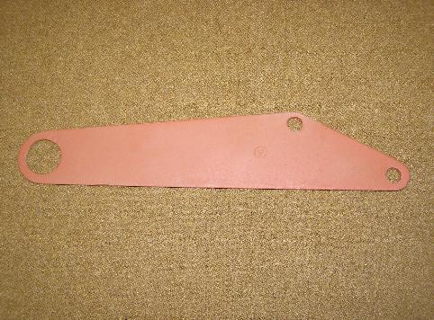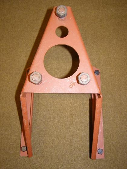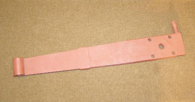 | Torque Reaction Spring, above left photo. The Torque Reaction Spring was mounted on the drivers side of the suspension under the normal spring to counter balance the engine during starting. This spring was used from May 1942 to the end of GPW production. Master Cylinder Tie Bar, above right photo. This master cylinder tie bar is marked with a script "F" inside of a circle. |
