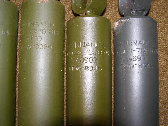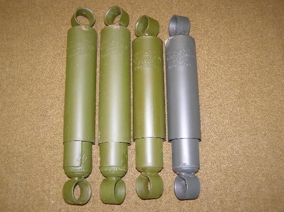| Reproduction Shock Absorbers, above left photo. Shock Absorbers installed on the GPW were manufactured by Gabriel. The original rear shock absorbers had a flared lower end on the outer tube as well as a stone guard on the inner tube. These reproductions are marked ORDNANCE G503-7703114 A170 GPW18080 (rear shock absorber) and ORDNANCE G503-708875 A6902 GPW18045 (front shock absorber). All four shock absorbers are shown without the rubber bushing installed. |