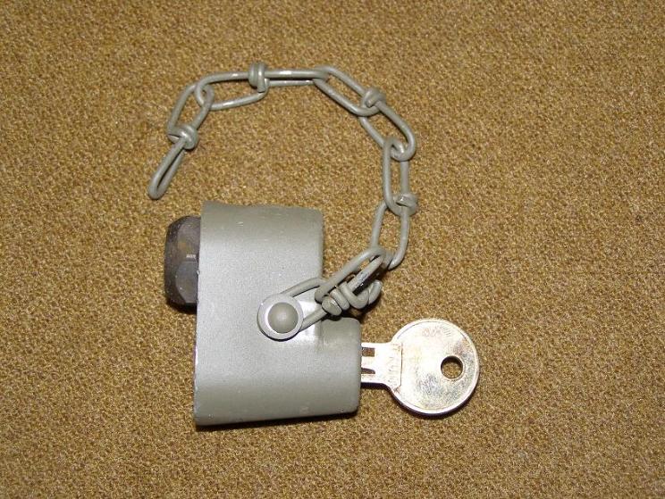| Spare Wheel Carrier, left photo. The 3 stud spare wheel carrier was used from the start of GPW production through September 1943. This carrier is marked on the face with a large script "F". Spare Wheel Lock with Key, right photo. The spare wheel lock with key was only used with the 3 stud spare wheel carrier. |