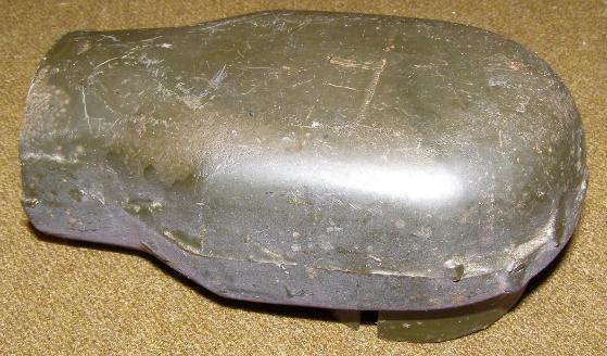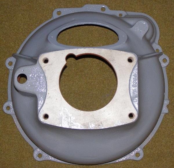 | GPW Flywheel Bell Housing, above photo. This bell housing is marked with a script Ford F on the driver's side of the transmission mating surface and the part number GPW 6394 on the passenger side. On the driver's side of the housing just behind the engine mounting holes, are the remains of two rivets for a rebuild plate. This style of plate was usually added during depot rework and in the case of this housing, the replacement of the clutch. This housing is the early GPW style without the raised boss on the passenger side of the housing to support the emergency brake cable. It does have a threaded hole added to support the emergency brake cable. |
