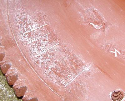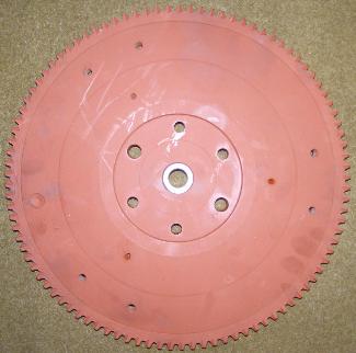 | GPW Flywheel, above three photos. This flywheel came with this GPW. The wheel is marked with a scrip Ford F and the Daimler-Benz Gaggenau engine rebuild work number 5776. This number matches the hand stamped markings on the crankshaft. This flywheel has a new old stock ring gear added and has been painted in red oxide primer. The markings have been highlighted with chalk. |