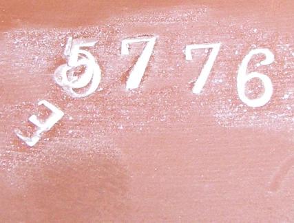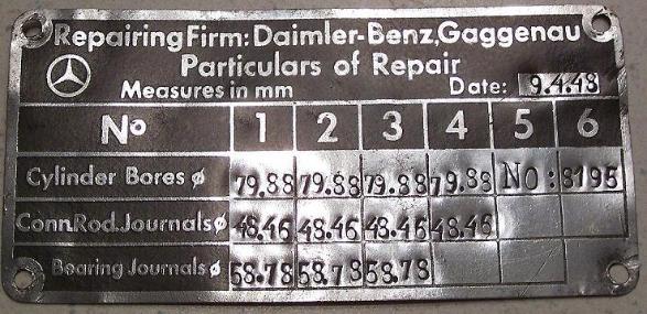 | Crankshaft, above photo. This Crankshaft was re-machined when this GPW engine was rebuilt by Daimler-Benz in Gaggenau Germany in 1948. The Main Bearing Journals were machined to 58.78mm (as seen on the rebuild plate below) and the cast counterweight area stamped 010. This crankshaft has also been stamped 5776 which may have been the job number assigned to this machining process at Daimler-Benz. The Connecting Rod Journals were machined to 48.46mm. |