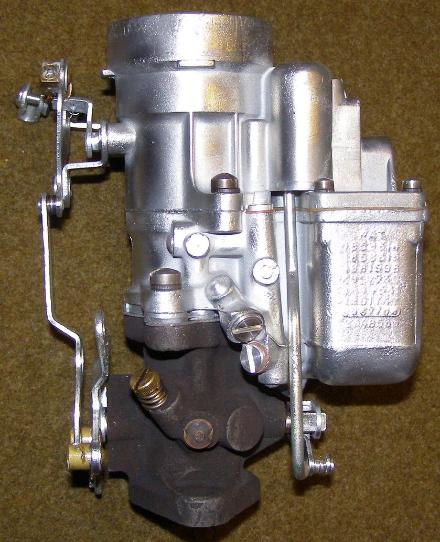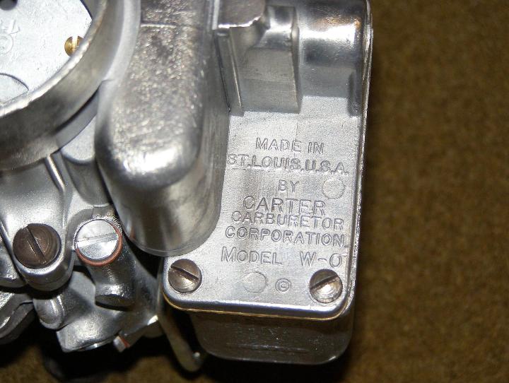 | Carburetor - Carter Model 539, above left and right photo. The Carburetor used throughout Ford GPW production the Carter Model 539. This Model 539 has been restored. The body is natural aluminum and the cast iron base has a grey color. The front of the carburetor bowl has 9 Patent numbers. Carburetors with 12 Patent number are post World War Two. |