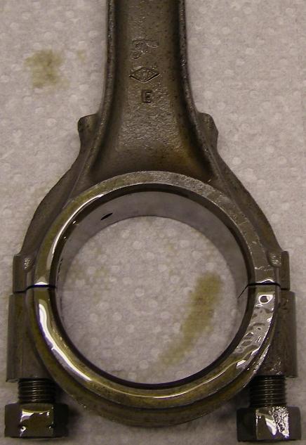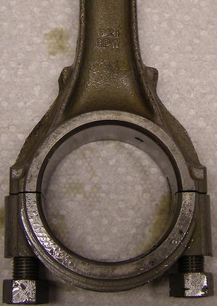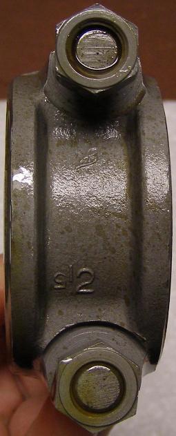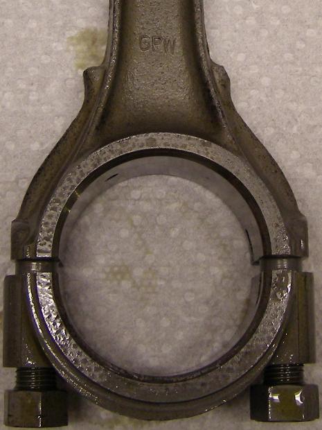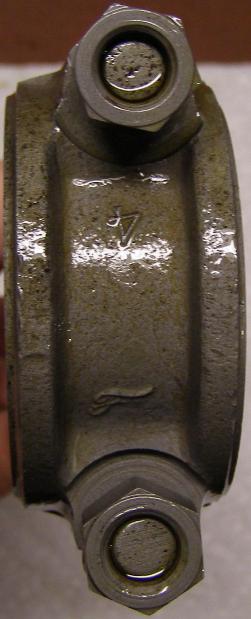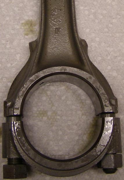 | No 2 Connecting Rod, above three photos. The Connecting Rod Cap is cast with the raised markings: "2" (for #2 cylinder) "15" and a script "F". One side of the connecting rod is cast with the raised markings: W (inside of a diamond) above an "E" with a script "F". The reverse of the connecting rod is cast with the raised markings: "P21" above "GPW". |
