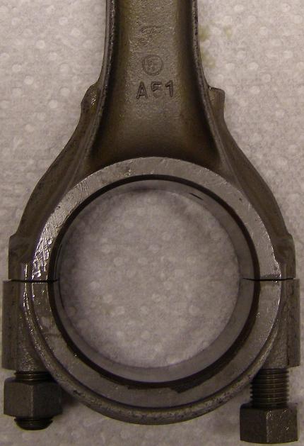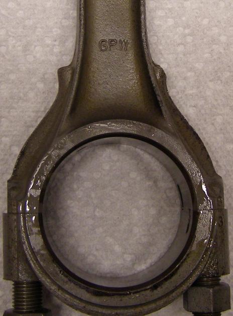 | No 4 Connecting Rod, above three photos. The Connecting Rod Cap is cast with the raised markings: "4" (for #4 cylinder) "19" and a script "F". One side of the connecting rod is cast with the raised markings: W (inside of a diamond) above "F" with a script "F". The reverse of the connecting rod is cast with the raised markings: "GPW" and "RZO". |