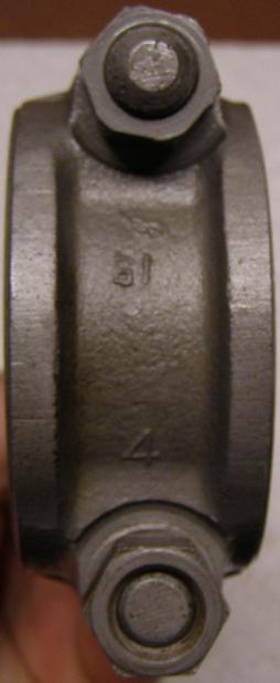 | No 3 Connecting Rod, above three photos. The Connecting Rod Cap is cast with the raised markings: "3" (for #3 cylinder) "1" and a script "F". One side of the connecting rod is cast with the raised markings: HF (inside of a circle) above "A51" with a script "F". The reverse of the connecting rod is cast with the raised markings: "GPW". |
