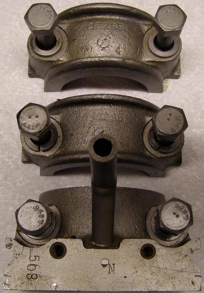 | Crankshaft Caps, left photo. The crankshaft caps are machined to match the engine block during production. The top cap is cast with the part number 638288 above W4 (W4 is a Wilson Foundry Company production number). The center cap is cast with the part number 638288 above W6 (W6 is a Wilson Foundry Company production number). The bottom or rear cap does not have any cast part numbers, but is stamped "568" and "N". 568 may have been a job number that was stamped into the cap during rebuild at Daimler-Benz in Gaggenau in 1948. All six crankshaft bolts are marked in raised numbers: 9437. |