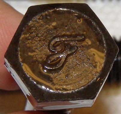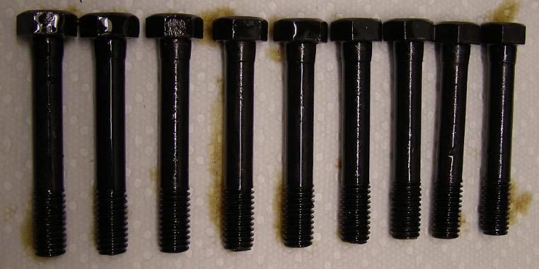| Head Bolts, above left and right photo. The cylinder head is attached with 9 "F" marked Head Bolts and 6 Studs. |