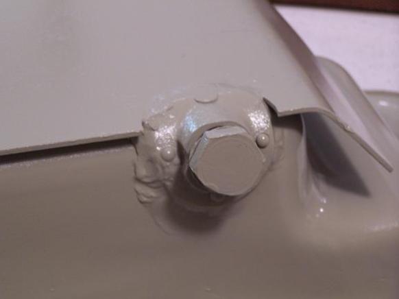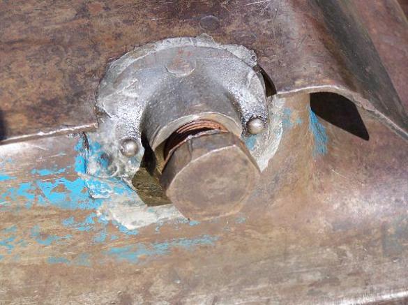 | Oil Pan, above left and right photo. The left photo is a view of the oil pan drain plug prior to restoration. This oil pan drain plug is the early style which used a cast iron drain boss, attached to the pan with three rivets and sealed with solder. This method was used from the start of GPW production through 1942. After 1942 this style was no longer produced. The medium blue paint was applied to the engine when it was rebuilt in 1948 by Daimler-Benz. The photo on the right was taken after the oil pan was sand blasted and repainted with the wartime Ford "Cold Slate-Grey" engine paint. |