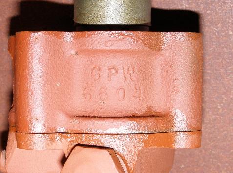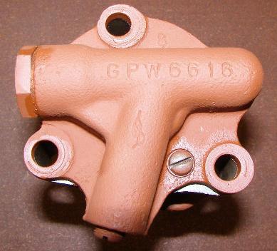 | Oil Pump, left and above two photos. The Oil Pump is located on the drivers side of the GPW Engine. The main body of the pump is cast with the part number GPW 6604 with a script "F". The body is also cast with the number 8. The top of the pump is cast with the part number GPW 6616 with a script "F". The top is also cast with the number 8. |