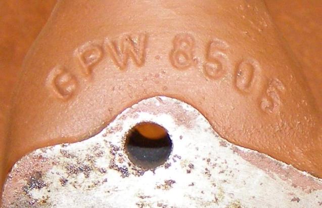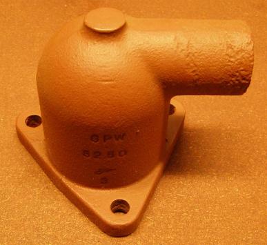 | Cylinder Head, above left photo. The Cylinder Head is cast with the raised part number GPW 6050 with a script "F" and the number 2. Thermostat Housing, above right photo. The Thermostat Housing is cast with the part number GPW 8250 with a script "F" and the number 3. |