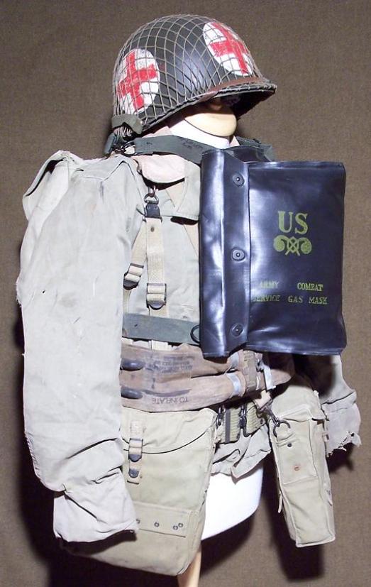 | M-1 Helmet and Camouflage Net with Medic's markings M-1 Helmet Liner, made by FIRESTONE M-1941 Field Jacket with "Rangers" Diamond Patch on left sleeve M-1923 Dismounted Cartridge Belt, made by NERIS 1943 M-1936 Field "Musette" Bag, made by AIRTRESS MIDLAND 1943 M-1910 Dismounted Canteen Cover, made by FOLEY MFG CO. 1942 M-1910 Canteen, made by S.M.CO. 1943 M-1910 Dismounted Canteen Cover, made by H.S.CO. 1942 M-1910 Canteen, made by VOLLRATH 1943 M-1942 First Aid Pouch, made by JQMD 1944 Medical Bag, pair M-7 Assault Gas Mask Carrier USN Life Preserver, made by THE FIRESTONE TIRE & RUBBER CO. AKRON OHIO |