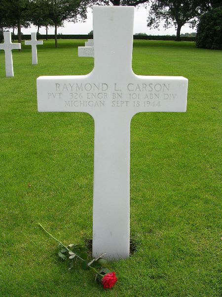 | Raymond L. Carson Private, U.S. Army Service # 36176352 326th Engineer Battalion, 101st Airborne Division Entered the Service from: Michigan Died: 18-Sep-44 Buried at: Plot M Row 19 Grave 1 Netherlands American Cemetery Margraten, Netherlands |
