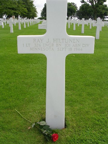 | Ray J. Hiltunen First Lieutenant, U.S. Army Service # O-1103214 326th Engineer Battalion, 101st Airborne Division Entered the Service from: Minnesota Died: 18-Sep-44 Buried at: Plot K Row 6 Grave 16 Netherlands American Cemetery Margraten, Netherlands |