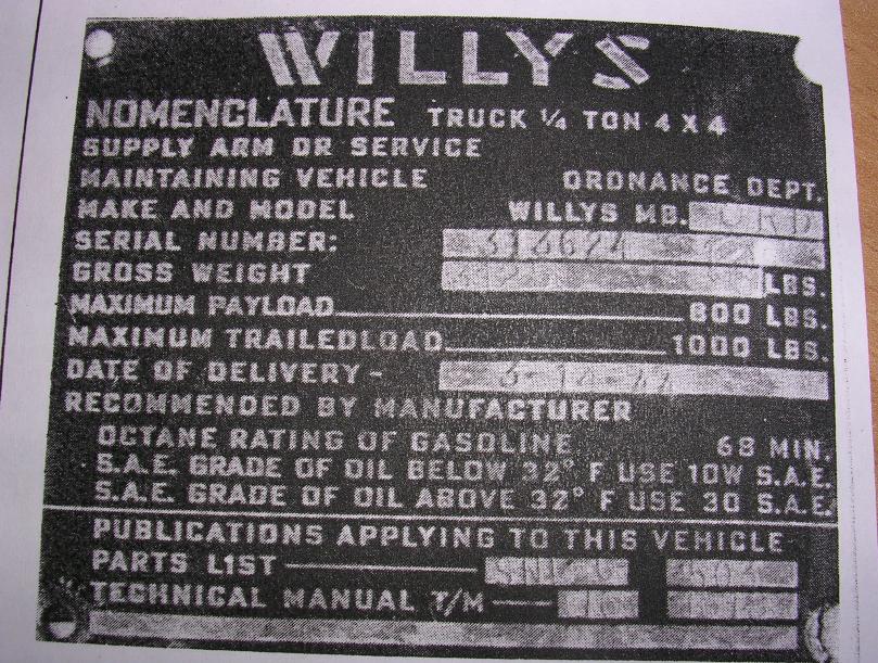 | Willys Nomenclature Plate, above photo. The nomenclature plate pictured above was removed from the Willys MB 1/4 Ton Truck Serial Number 313624 that was carried by the CG-4A 42-79151 Glider named "Queen City". This Jeep was delivered March 14th 1944. The current location of the Willys MB "Jeep" is unknown. |