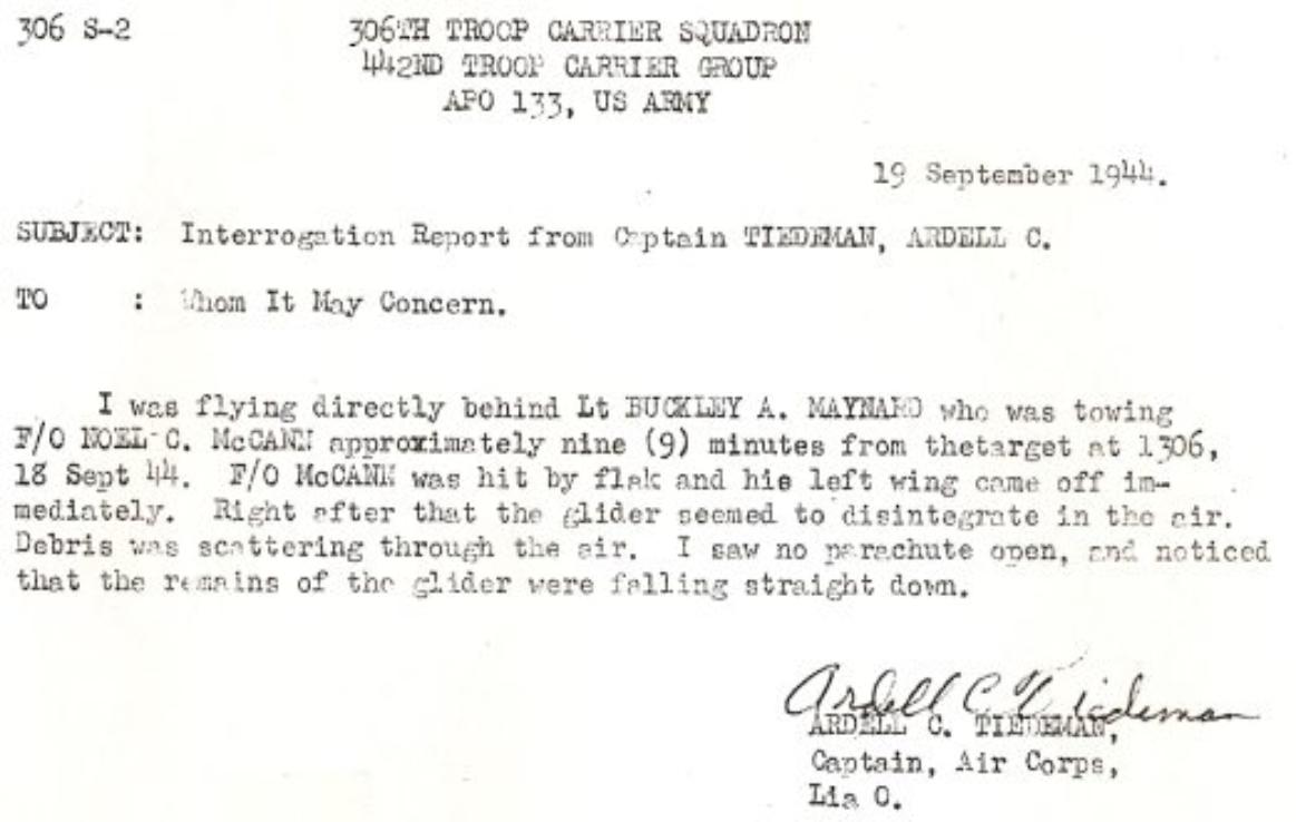 | United States Officer 326th Airborne Engineer Battalion, 101st Airborne Division 306th Troop Carrier Squadron, 442nd Troop Carrier Group F/O Noel Clarence McCann T-122016 CG-4A "Queen City" Glider Pilot Killed In Action - September 18th 1944 "Operation Market Garden" |