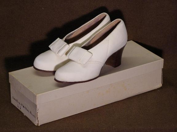 | Nomenclature tag, left photo. The tag is marked: Uniform, Cotton, Seersucker, Nurses, Size 14 Annette Sportswear P.O. 13921 Dated Feb. 15, 1944 Spec. P.Q.D. No. 137B Dated April 29, 1944 Stock No. 55-U-9514 Phila. Q.M. Depot Shoes, Pump, White Dress, Women's with issue box; right photo. These shoes are a size 6 1/2 and were made by GRADDOCK-TERRY |