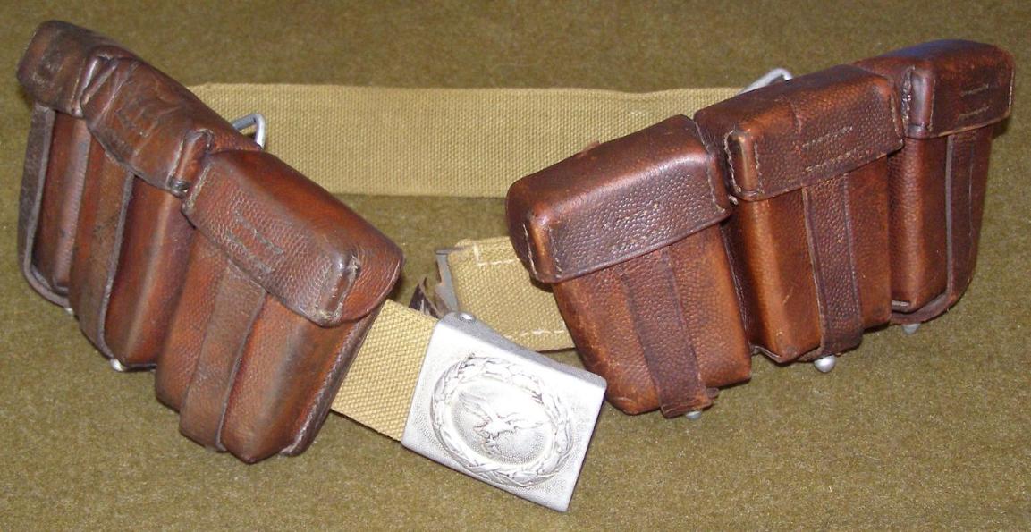 | German Luftwaffe Tropical Belt and Buckle with Mauser K-98 Ammunition Pouches, above photo. The tropical belt is constructed from khaki/green canvas with a steel buckle catch on one end and is marked 0/0684/0005 which is a RB number (Reichs Betriebnummer - National Factory Code Number) which indicates manufacture after late 1942 and is marked with the size 85. The Mauser K-98 Ammunition Pouches are the early style, constructed from natural brown pebble grain leather with aluminum hardware with belt loops that fold under the pouches and attach to the closure studs. The pouch on the wearers left is marked on the reverse: WILHELM HANSEN & BRAUN, SONNGEN 1936. The inside of the center pouch lid is ink stamped: B SM35. The pouch on the wearers right is marked on the reverse: maker unreadable, BERLIN 1935. The reverse is hand marked with the number 195 in black paint. The center pouch lid is ink stamped, but unreadable. |