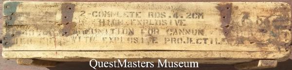 | Nothing makes a WWII display or reenactment-site look more accurate than having piles of equipment and crates piled around. Advancing Armies consume tons of food and ordnance - every day. Crates were and are very common on the battlefield. An advancing vehicle is often piled with everything that the Soldier, Sailor or Marine needed for a period of prolonged detachment - crates of food and ordnance. And when the crate was emptied, it was used for storage, turned into furniture, filled with earth and rock to create a fighting position and then lastly to mail home souvenirs. After many years of research and development, restoring individual items for the museum collection - and after many requests by fans, QuestMasters has decided to offer restoration supplies for the historian, re-enactor and enthusiast. The following crate stencils have been digitally rendered from original examples in the museum collection. Each crate set will include: sides, lid stencils and dimensions of the original crate, as each had been delivered by the Quartermaster Corps or Ordnance Corps during WWII. Replica crates can be easily created from reclaimed wood from modern wood shipping pallets. If there is a stencil or product that we can make for you: WWI, WWII, Home Front, Korean Conflict or Vietnam Conflict, for example - just ask! email: questmasters@hotmail.com Additionally, if there is a specific date, lot number or manufacturer that you are trying to match on a crate, this custom work can also be done at no charge! Just ask for it with your order. No original or replica ordnance is for sale on this page. All ordnance pictured is BATFE compliant, inert. |