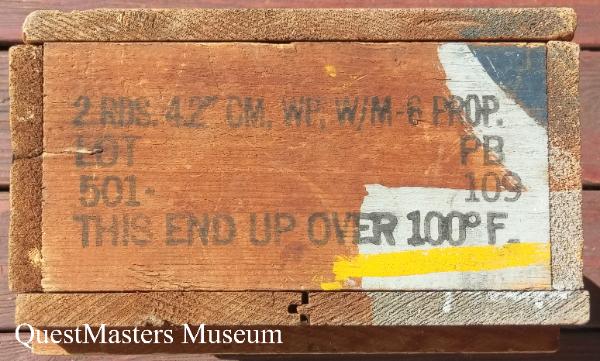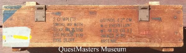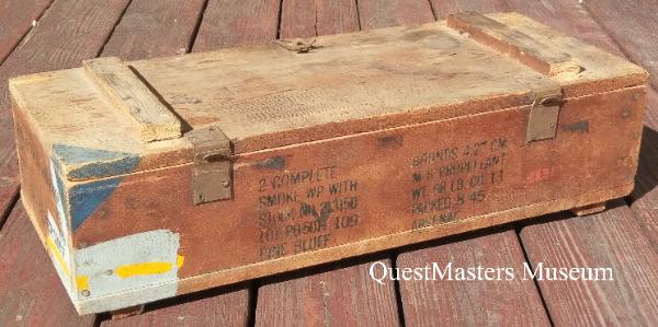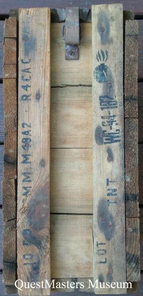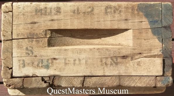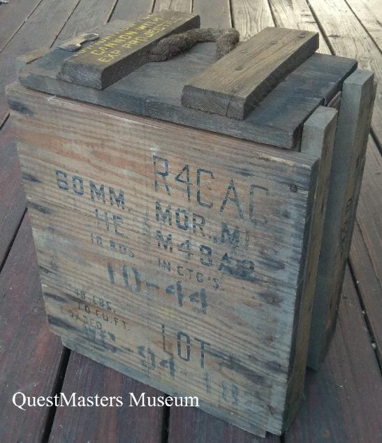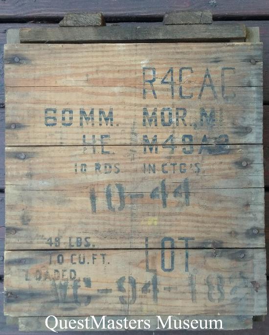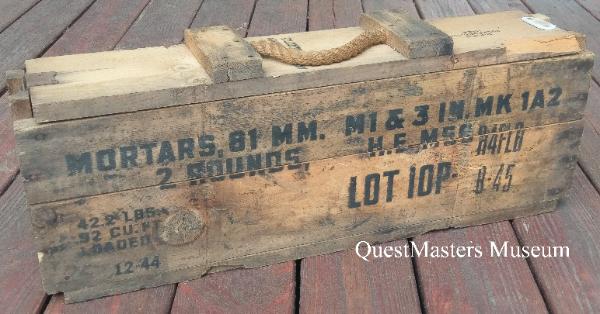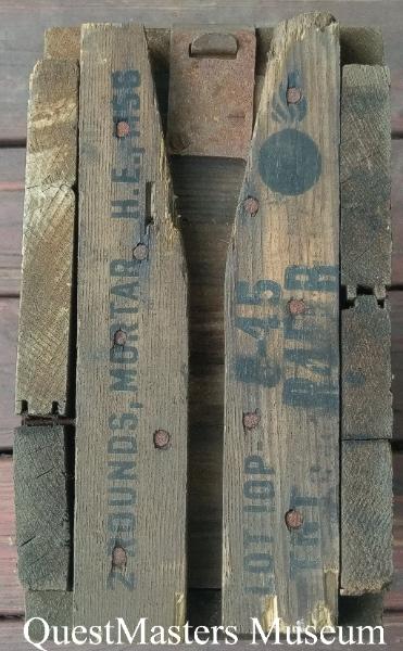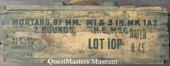 | Replica WWII 75mm Howitzer and 75mm Gun, M48 High Explosive Shell, "Lobster" Shipping Crate, R1MLA 1943, with replica fiber tubes, sealing tapes, and replica cloverleaf bundles, fully banded and ready to display with your Pack Howitzer, Airborne or Infantry Display or with your M-4 "Sherman" tank. Available in factory WWII brown stain or paint with original replica Ordnance Plant markings. WWII 81mm Mortar "Lobster" Shipping Crate is also available. Individual WWII 75mm Howitzer, 75mm Gun, and 81mm Mortar M43 and M56/M57 replica fiber shipping tubes with original end caps are also available. These are fully functional, open and are able to store rounds for display. Email for availability: questmasters@hotmail.com |