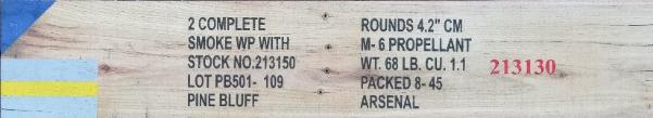 | Original 4.2 Inch Chemical Mortar, Smoke, White Phosphorus, with M-6 Propellant, shown left. This crate originally contained 2 rounds of 4.2 Inch Chemical Mortar White Phosphorus Shells with M-6 Propellant. This crate was produced August 1945. The crate has the grey with blue corner markings for Chemical Warfare Service overseas shipping. The side stencil is separated in two sections so that a steel banding strap can be attached to the crate for shipment. The stencil is separated so that no markings are obscured when the band is attached. The replica, Stencil C123, is shown above. This stencil kit includes side, both end stencils and lid, to include the Chemical Warfare Service insignia. |