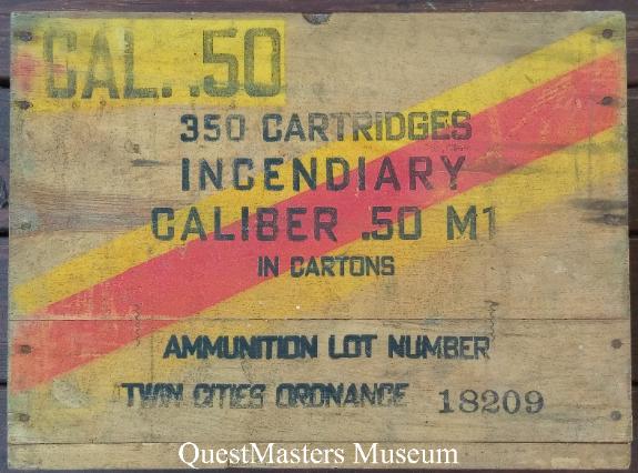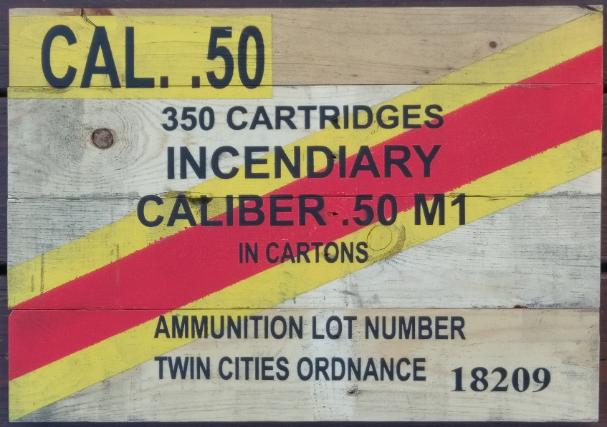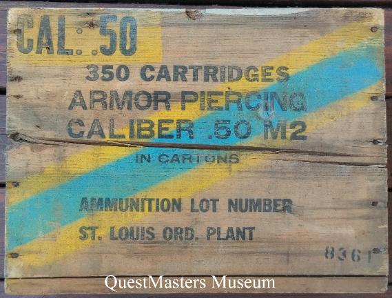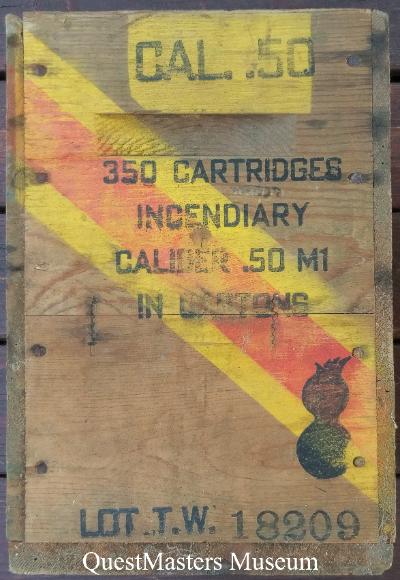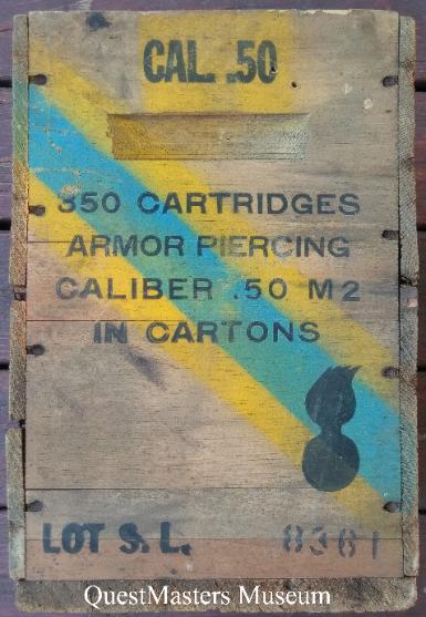 | Wire-bound Crate, C132 Fully assembled for display: 220 Caliber .50 T1ICN 4 Armor Piercing M2 / 4 Incendiary M1 / 2 Tracer M1, Belted, Repacked Lot CB B76038. Plus two Ammunition Box Stencils. $70 |