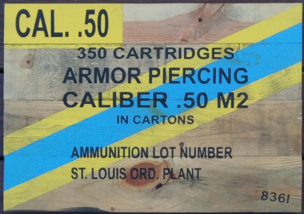 | Original .50 Caliber Armor Piercing M2 crate, shown left. This .50 Caliber Armor Piercing M2 (blue/yellow band) crate was produced by Saint Louis Ordnance Plant, Missouri, Lot 8361 in 1942. The replica, Stencil C119, is shown above. This stencil kit includes both sides, both end stencils and lid, to include the Ordnance Corps insignia. The stencil kit does not include the blue/yellow markings, these can be done with masking tape. |