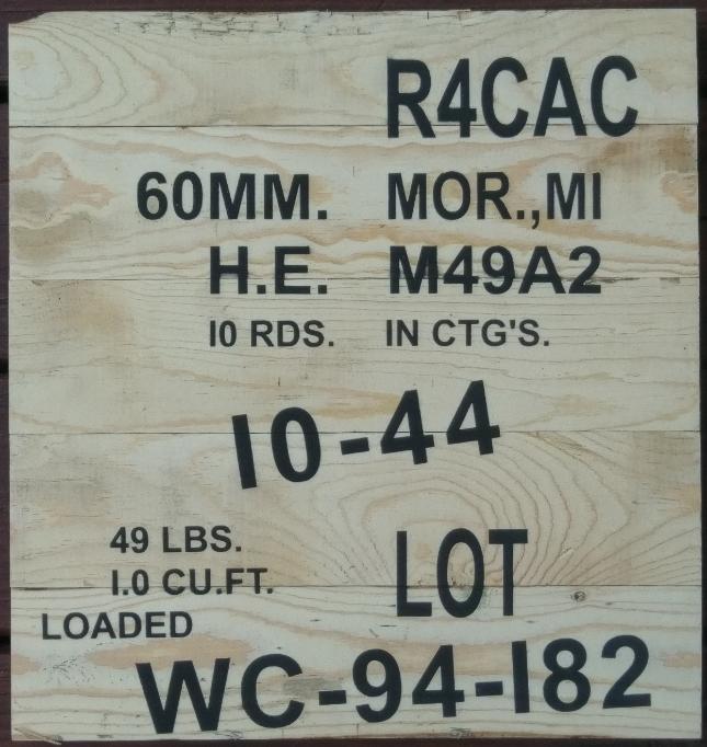 | Original 60mm M49A2 High Explosive Mortar Shell Crate, shown left. This R4CAC 60mm High Explosive Mortar Crate was produced with a black stencil, Lot Number WC-94-182, by Newton Brothers Lumber Company, Tuscaloosa Alabama, October 1944. A similar crate in the QuestMasters Museum collection was produced with a yellow stencil, Lot Number WC-94-162, by Morton Box Company, October 1944. Either yellow or black stenciling on natural wood are correct for this time period. This side stencil is separated in two sections for the provision of a steel banding strap for shipment. The replica, Stencil C121, is shown above. This stencil kit includes side, both end stencils and lid, to include the Ordnance Corps insignia. |